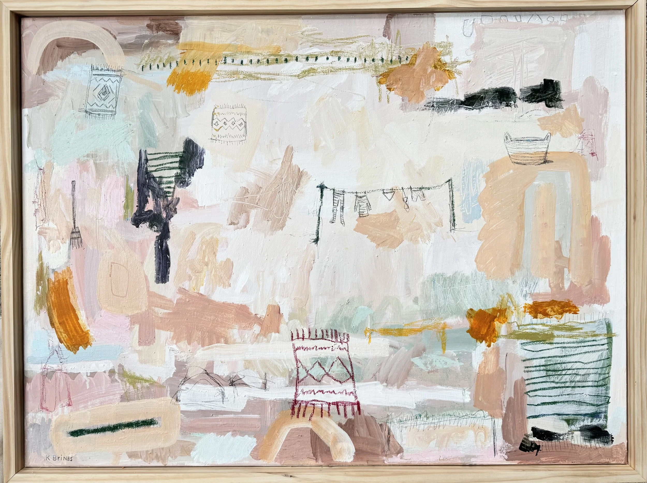 This piece, titled ‘In the Woods on a Sunday’ is inspired by our Sunday Norwegian tradition of heading to the tall pine woods for a hike. We’d grab our dog, pack up our coffee/tea thermos, and head to the vast woods. Most stores and cafes are closed on Sundays in Norway and while this was inconvenient at first, I grew to love that Sundays were reserved for nature and getting outside. The colors and textures in this painting reflect the Norwegian woods that I grew to love. I’ve also incorporated some of the motifs that are nostalgic for me - clothes hanging on the line, brooms, and my late Mom’s eclectic collection of rugs. This piece has it all: movement, texture, and a little bit of whimsy for good measure.